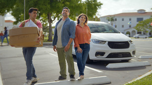 “Boy Mom” highlights the challenges of a mother of four boys under ten. “Empty Nest” shows two parents dropping off their youngest at college and then enjoying the space and features of the Pacifica for themselves. Finally, “Dog Mom” expands the traditional family definition to include pet parents as it observes one young woman keeping her very large St. Bernard happy as they travel.