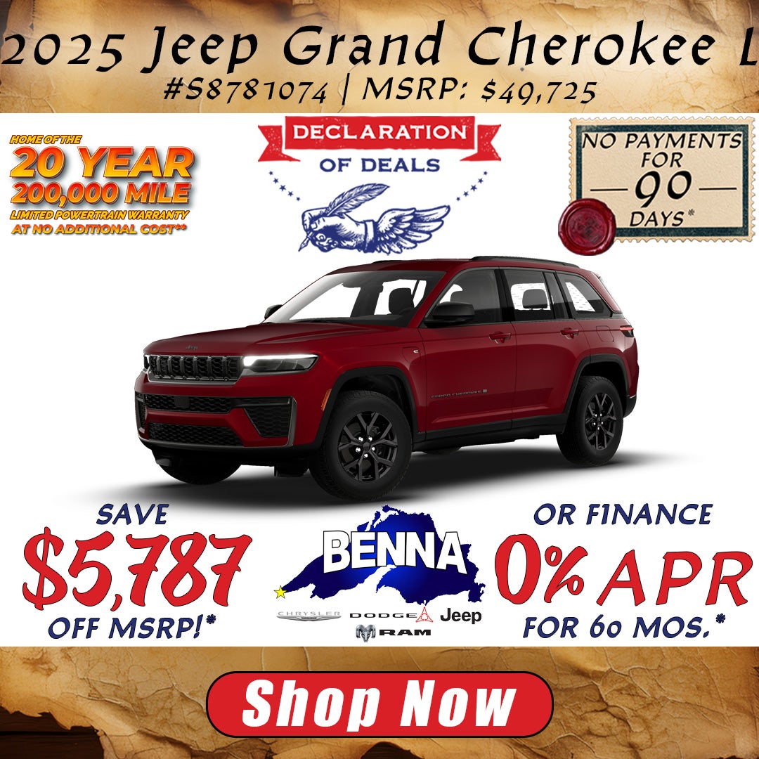 *Stock #S8781074. MSRP: $49,725. MSRP may not represent actual sales price. Total savings of $5,787 off MSRP which includes $1,287 Benna Dealer Discount + $2,500 National Retail Bonus Cash + $2,000 National Bonus Cash. Buy for $43,938 plus tax, title, license and $499 service fee. On approved credit. Vehicle subject to prior sale. See dealer for details. Offer ends 4/30/2026. Or finance with available 0% APR (Annual Percentage Rate) for 60 months. Total savings of $1,287 which includes $1,287 Benna Dealer Discount. Buy for $48,438 plus tax, title, license and $499 service fee. Must finance with SFS (Stellantis Financial Services). On approved credit. Vehicle subject to prior sale. See dealer for details. Offer ends 4/30/2026. **20 Year / 200,000 Mile Limited Warranty Available on qualifying new vehicle purchases only. Warranty is not included with leases. Other restrictions may apply due to vehicle type, engine, mileage, and model year. See dealer for complete details. ***No Payments For 90 Days available on eligible 2025 and 2026 Chrysler Dodge Jeep Ram vehicles. 1st payment deferred up to 90 days from sale date. Interest accrues from sale date. Must finance through Stellantis Financial Services. Excluding 84-month financing. For well-qualified buyers, not all buyers will qualify. Contact dealer for complete details. Offer ends 4/30/2026.