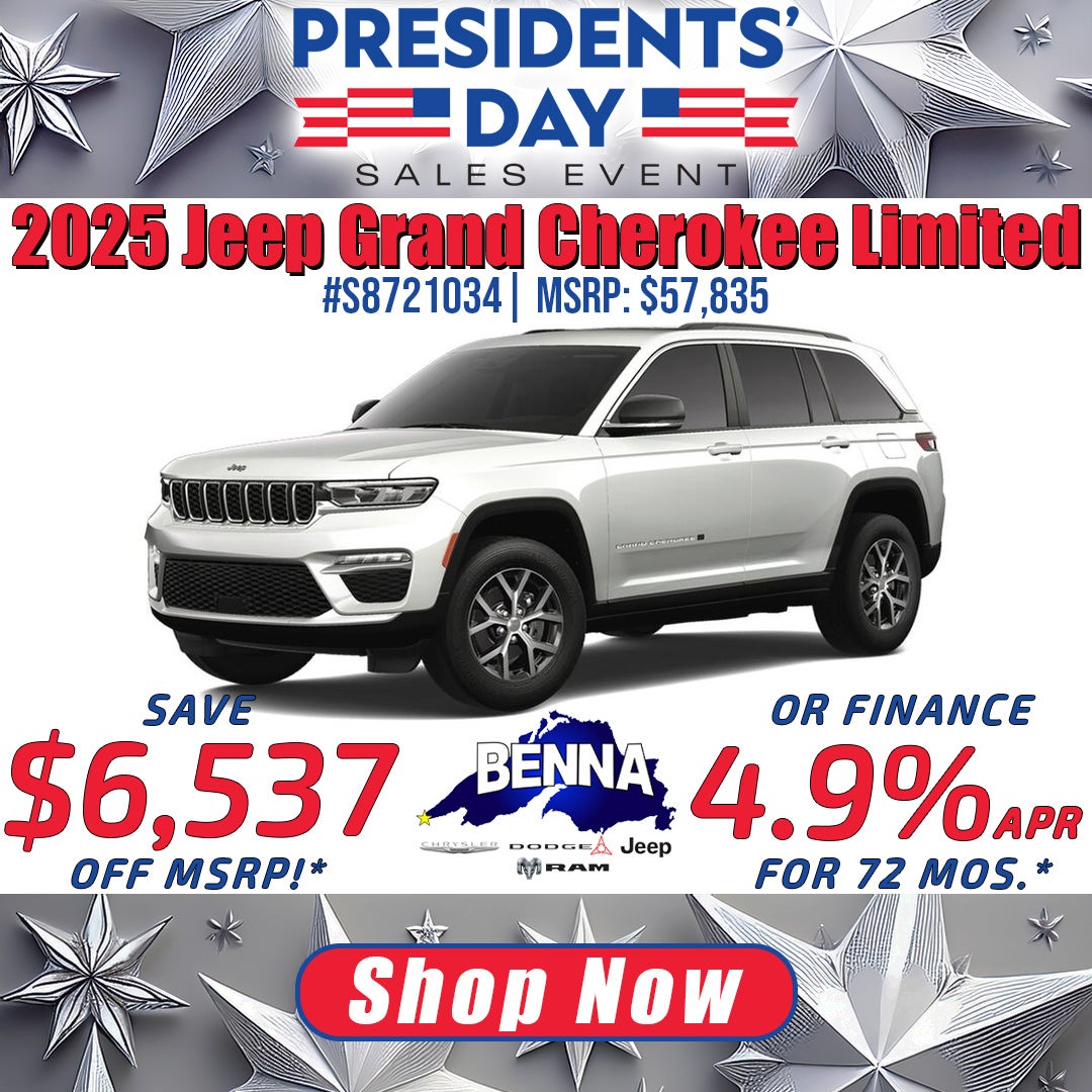 *Stock #S8721034. MSRP: $57,835. MSRP may not represent actual sales price. Total savings of $6,537 off MSRP which includes $1,287 Benna Dealer Discount + $2,250 National Retail Bonus Cash + $2,000 National Select Inventory Bonus Cash + $1,000 Midwest BC SFS Retail Bonus Cash. Buy for $51,298 plus tax, title, license and $499 service fee. On approved credit. Vehicle subject to prior sale. See dealer for details. Offer ends 3/2/2026. Finance with available 4.9% APR (Annual Percentage Rate) for 72 months. Total savings of $1,287 off MSRP which includes $1,287 Benna Dealer Discount. Buy for $56,548 plus tax, title, license and $499 service fee. Must finance with SFS (Stellantis Financial Services). On approved credit. Vehicle subject to prior sale. See dealer for details. Offer ends 3/2/2026. **20 Year / 200,000 Mile Limited Warranty Available on qualifying new vehicle purchases only. Warranty is not included with leases. Other restrictions may apply due to vehicle type, engine, mileage, and model year. See dealer for complete details.
