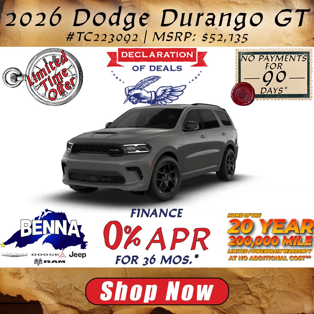 *Stock #TC223092. MSRP: $52,135. MSRP may not represent actual sales price. Finance with available 0% APR (Annual Percentage Rate) for 36 months. Total savings of $665 which includes $665 Benna Dealer Discount. Buy for $51,470 plus tax, title, license and $499 service fee. Must finance with SFS (Stellantis Financial Services). On approved credit. Vehicle subject to prior sale. See dealer for details. Offer ends 4/30/2026. **20 Year / 200,000 Mile Limited Warranty Available on qualifying new vehicle purchases only. Warranty is not included with leases. Other restrictions may apply due to vehicle type, engine, mileage, and model year. See dealer for complete details. ***No Payments For 90 Days available on eligible 2025 and 2026 Chrysler Dodge Jeep Ram vehicles. 1st payment deferred up to 90 days from sale date. Interest accrues from sale date. Must finance through Stellantis Financial Services. Excluding 84-month financing. For well-qualified buyers, not all buyers will qualify. Contact dealer for complete details. Offer ends 4/30/2026.