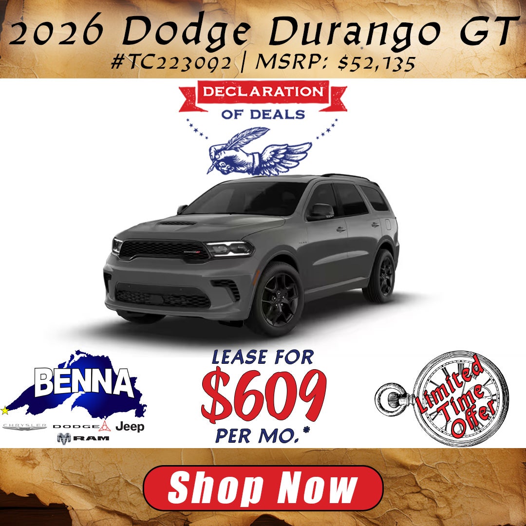*Stock #TC223092. MSRP: $52,135. MSRP may not represent actual sales price. 36 Month lease, 10,000 miles per year, $4,999 due at lease signing or trade equity, plus $665 Benna Dealer Discount. To all qualified lessees plus tax, title, license, and $499 service fee and $595 acquisition fee. Must lease with Stellantis Financial Services. For well-qualified buyers. Not all buyers will qualify. On approved credit. Vehicle subject to prior sale. See dealer for details. Offer ends 4/30/2026.