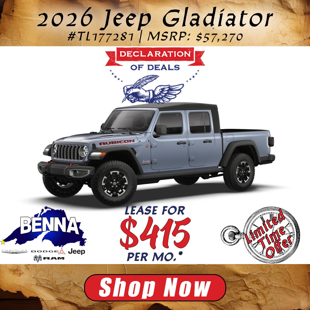 *Stock #TL177281. MSRP: $57,270. MSRP may not represent actual sales price. 39 Month lease, 10,000 miles per year, $4,999 due at lease signing or trade equity, plus $770 Benna Dealer Discount. To all qualified lessees plus tax, title, license, and $499 service fee and $595 acquisition fee. Must lease with Stellantis Financial Services. For well-qualified buyers. Not all buyers will qualify. On approved credit. Vehicle subject to prior sale. See dealer for details. Offer ends 3/31/2026.