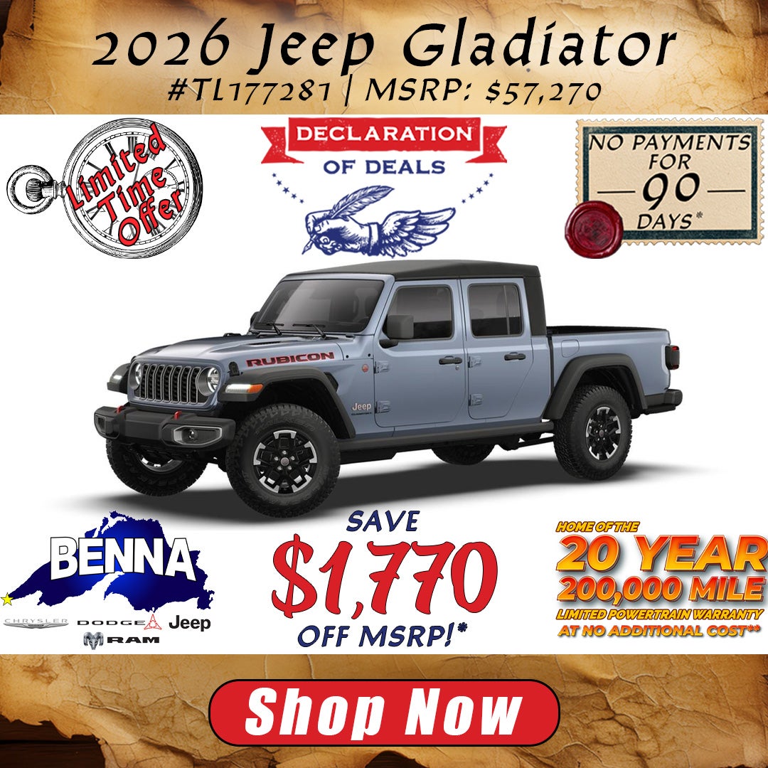 *Stock #TL177281. MSRP: $57,270. MSRP may not represent actual sales price. Total savings of $1,770 off MSRP which includes $770 Benna Dealer Discount + $1,000 National Retail Bonus Cash. Buy for $55,500 plus tax, title, license and $499 service fee. On approved credit. Vehicle subject to prior sale. See dealer for details. Offer ends 4/30/2026. **20 Year / 200,000 Mile Limited Warranty Available on qualifying new vehicle purchases only. Warranty is not included with leases. Other restrictions may apply due to vehicle type, engine, mileage, and model year. See dealer for complete details. ***No Payments For 90 Days available on eligible 2025 and 2026 Chrysler Dodge Jeep Ram vehicles. 1st payment deferred up to 90 days from sale date. Interest accrues from sale date. Must finance through Stellantis Financial Services. Excluding 84-month financing. For well-qualified buyers, not all buyers will qualify. Contact dealer for complete details. Offer ends 4/30/2026.