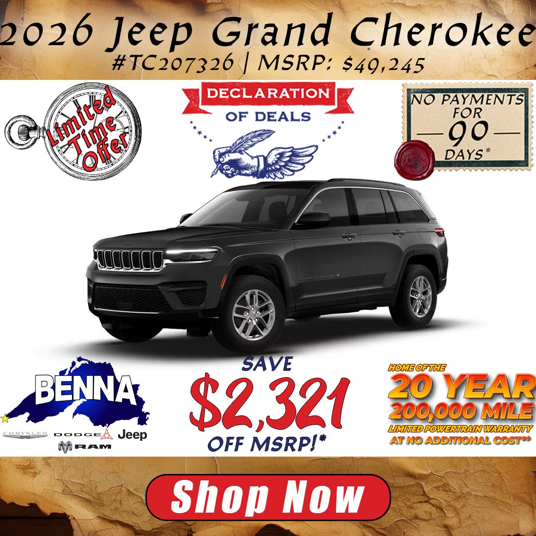 *Stock #TC207326. MSRP: $49,245. MSRP may not represent actual sales price. Total savings of $2,321 which includes $821 Benna Dealer Discount + $1,500 National Retail Bonus Cash. Buy for $46,924 plus tax, title, license and $499 service fee. On approved credit. Vehicle subject to prior sale. See dealer for details. Offer ends 4/30/2026. **20 Year / 200,000 Mile Limited Warranty Available on qualifying new vehicle purchases only. Warranty is not included with leases. Other restrictions may apply due to vehicle type, engine, mileage, and model year. See dealer for complete details. ***No Payments For 90 Days available on eligible 2025 and 2026 Chrysler Dodge Jeep Ram vehicles. 1st payment deferred up to 90 days from sale date. Interest accrues from sale date. Must finance through Stellantis Financial Services. Excluding 84-month financing. For well-qualified buyers, not all buyers will qualify. Contact dealer for complete details. Offer ends 4/30/2026.