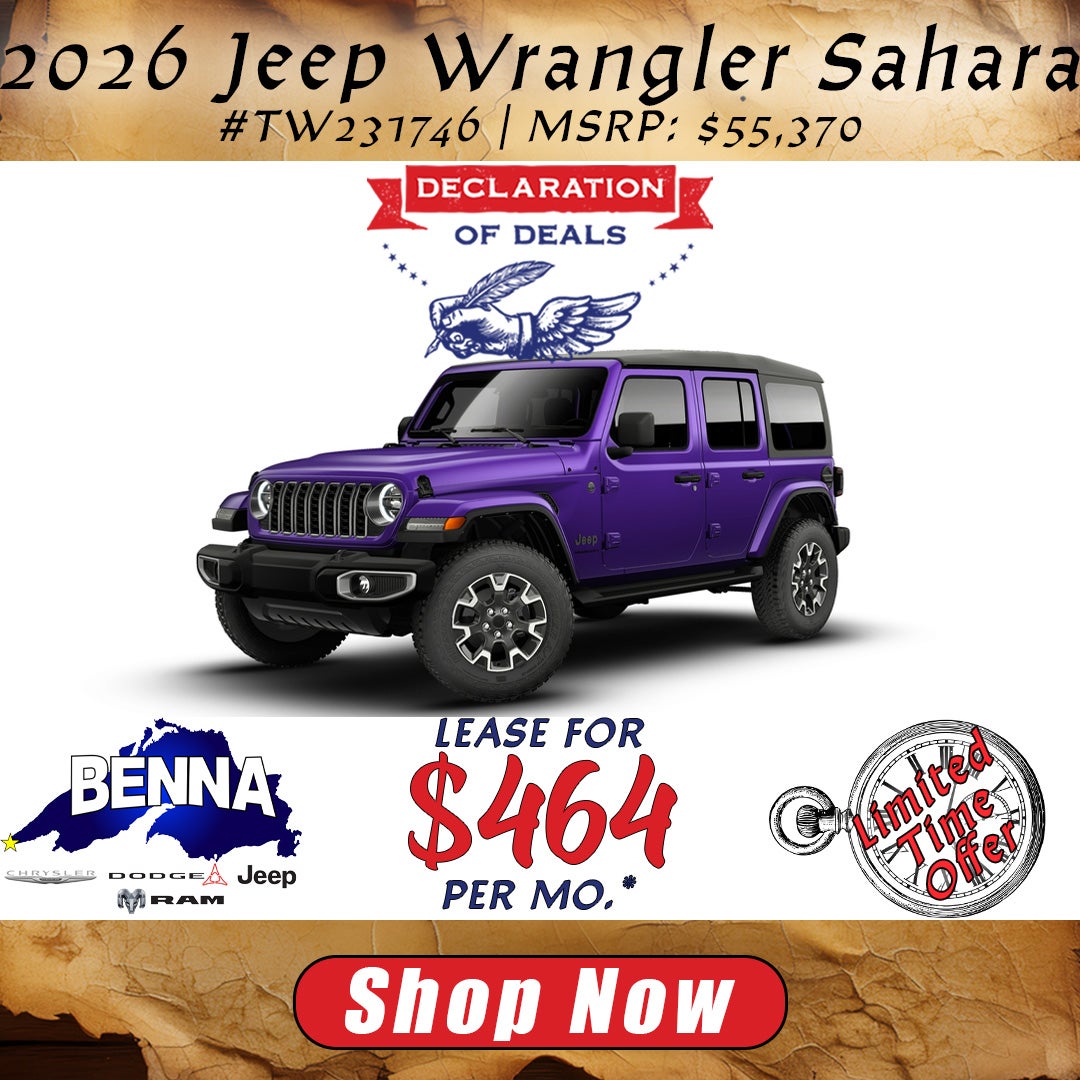 *Stock #TW231746. MSRP: $55,370. MSRP may not represent actual sales price. 36 Month lease, 10,000 miles per year, $4,999 due at lease signing or trade equity, plus $1,263 Benna Dealer Discount. To all qualified lessees plus tax, title, license, and $499 service fee and $595 acquisition fee. Must lease with Stellantis Financial Services. For well-qualified buyers. Not all buyers will qualify. On approved credit. Vehicle subject to prior sale. See dealer for details. Offer ends 4/30/2026.