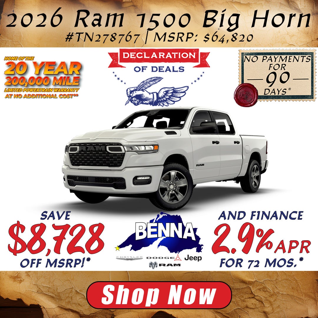 *Stock #TN278767. MSRP: $64,820. MSRP may not represent actual sales price. Finance with available 2.9% APR (Annual Percentage Rate) for 72 months. Total savings of $8,728 which includes $2,728 Benna Dealer Discount + $3,500 National Retail Bonus Cash + $1,500 Select Inventory Bonus Cash + $1,000 Midwest BC Regional Retail Bonus Cash. Buy for $56,092 plus tax, title, license and $499 service fee. Must finance with SFS (Stellantis Financial Services). On approved credit. Vehicle subject to prior sale. See dealer for details. Offer ends 4/30/2026. **20 Year / 200,000 Mile Limited Warranty Available on qualifying new vehicle purchases only. Warranty is not included with leases. Other restrictions may apply due to vehicle type, engine, mileage, and model year. See dealer for complete details. ***No Payments For 90 Days available on eligible 2025 and 2026 Chrysler Dodge Jeep Ram vehicles. 1st payment deferred up to 90 days from sale date. Interest accrues from sale date. Must finance through Stellantis Financial Services. Excluding 84-month financing. For well-qualified buyers, not all buyers will qualify. Contact dealer for complete details. Offer ends 4/30/2026.