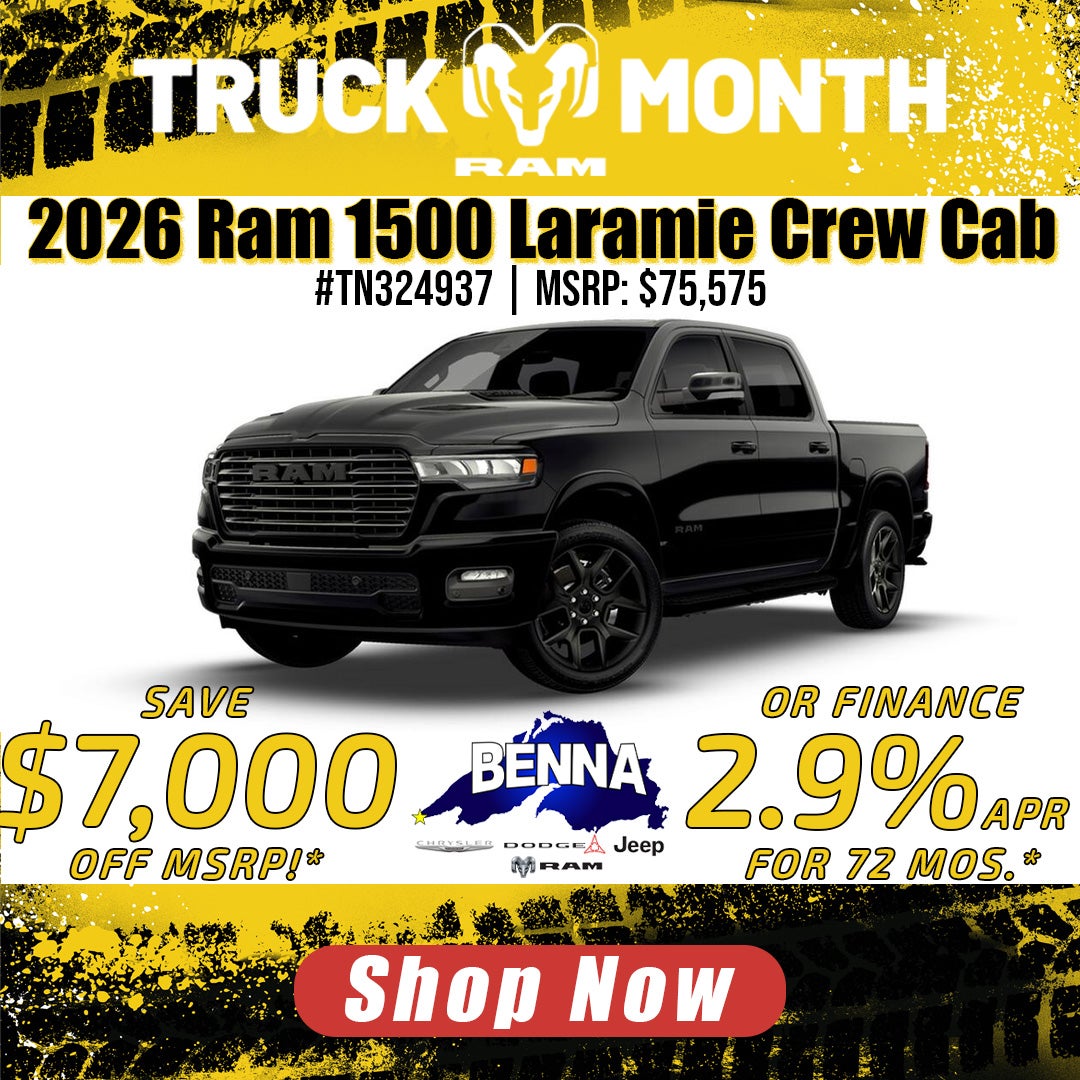 *Stock #TN324937. MSRP: $75,575. MSRP may not represent actual sales price. Total savings of $7,000 off MSRP which includes $2,500 Benna Dealer Discount + $3,500 National Retail Consumer Cash + $1,000 National Bonus Cash. Buy for $68,575 plus tax, title, license and $499 service fee. On approved credit. Vehicle subject to prior sale. See dealer for details. Offer ends 3/2/2026. Or finance with available 2.9% APR (Annual Percentage Rate) for 72 months. Total savings of $2,500 which includes $2,500 Benna Dealer Discount. Buy for $73,075 plus tax, title, license and $499 service fee. Must finance with SFS (Stellantis Financial Services). On approved credit. Vehicle subject to prior sale. See dealer for details. Offer ends 3/2/2026. **20 Year / 200,000 Mile Limited Warranty Available on qualifying new vehicle purchases only. Warranty is not included with leases. Other restrictions may apply due to vehicle type, engine, mileage, and model year. See dealer for complete details.