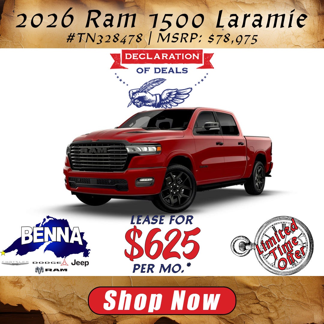 *Stock #TN328478. MSRP: $78,975. MSRP may not represent actual sales price. 39 Month lease, 10,000 miles per year, $4,999 due at lease signing or trade equity, plus $4,120 Benna Dealer Discount + $1,000 Midwest BC Lease Bonus Cash. To all qualified lessees plus tax, title, license, and $499 service fee and $595 acquisition fee. Must lease with Stellantis Financial Services. For well-qualified buyers. Not all buyers will qualify. On approved credit. Vehicle subject to prior sale. See dealer for details. Offer ends 4/30/2026.