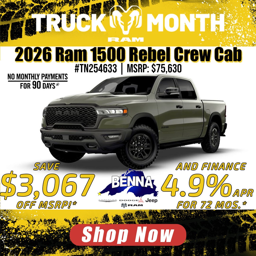 *Stock #TN254633. MSRP: $75,630. MSRP may not represent actual sales price. Finance with available 4.9% APR (Annual Percentage Rate) for 72 months. Total savings of 3,067 which includes $2,067 Benna Dealer Discount + $1,000 National Bonus Cash. Buy for $72,563 plus tax, title, license and $499 service fee. Must finance with SFS (Stellantis Financial Services). On approved credit. Vehicle subject to prior sale. See dealer for details. Offer ends 3/31/2026. **20 Year / 200,000 Mile Limited Warranty Available on qualifying new vehicle purchases only. Warranty is not included with leases. Other restrictions may apply due to vehicle type, engine, mileage, and model year. See dealer for complete details. ***No Payments For 90 Days available on eligible 2025 and 2026 Chrysler Dodge Jeep Ram vehicles. 1st payment deferred up to 90 days from sale date. Interest accrues from sale date. Must finance through Stellantis Financial Services. For well-qualified buyers, not all buyers will qualify. Contact dealer for complete details. Offer ends 3/31/2026.