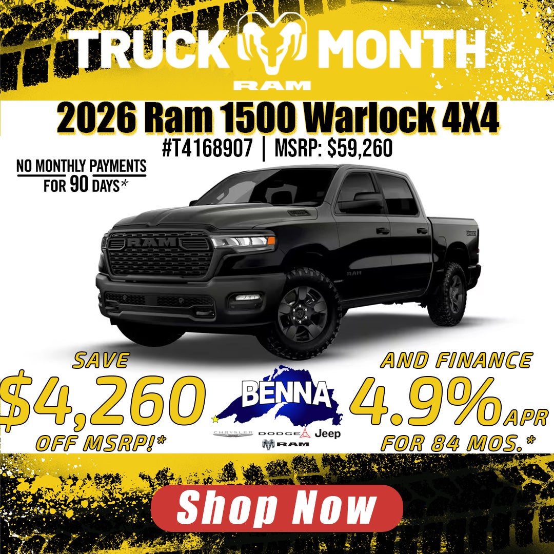 *Stock #T4168907. MSRP: $59,260. MSRP may not represent actual sales price. Finance with available 4.9% APR (Annual Percentage Rate) for 84 months. Total savings of $4,260 off MSRP which includes $760 Benna Dealer Discount + $3,500 National Retail Consumer Cash. Buy for $55,000 plus tax, title, license and $499 service fee. On approved credit. Vehicle subject to prior sale. See dealer for details. Offer ends 3/31/2026. **20 Year / 200,000 Mile Limited Warranty Available on qualifying new vehicle purchases only. Warranty is not included with leases. Other restrictions may apply due to vehicle type, engine, mileage, and model year. See dealer for complete details. ***No Payments For 90 Days available on eligible 2025 and 2026 Chrysler Dodge Jeep Ram vehicles. 1st payment deferred up to 90 days from sale date. Interest accrues from sale date. Must finance through Stellantis Financial Services. For well-qualified buyers, not all buyers will qualify. Contact dealer for complete details. Offer ends 3/31/2026.