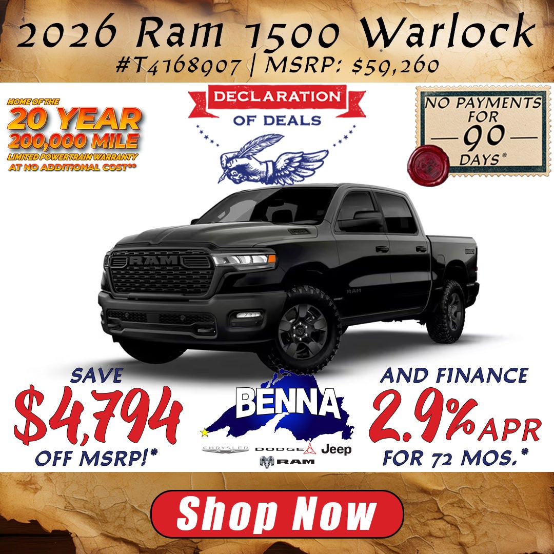 *Stock #T4168907. MSRP: $59,260. MSRP may not represent actual sales price. Finance with available 2.9% APR (Annual Percentage Rate) for 72 months. Total savings of $4,794 off MSRP which includes $1,294 Benna Dealer Discount + $3,500 National Retail Bonus Cash. Buy for $54,466 plus tax, title, license and $499 service fee. On approved credit. Vehicle subject to prior sale. See dealer for details. Offer ends 4/30/2026. **20 Year / 200,000 Mile Limited Warranty Available on qualifying new vehicle purchases only. Warranty is not included with leases. Other restrictions may apply due to vehicle type, engine, mileage, and model year. See dealer for complete details. ***No Payments For 90 Days available on eligible 2025 and 2026 Chrysler Dodge Jeep Ram vehicles. 1st payment deferred up to 90 days from sale date. Interest accrues from sale date. Must finance through Stellantis Financial Services. Excluding 84-month financing. For well-qualified buyers, not all buyers will qualify. Contact dealer for complete details. Offer ends 4/30/2026.