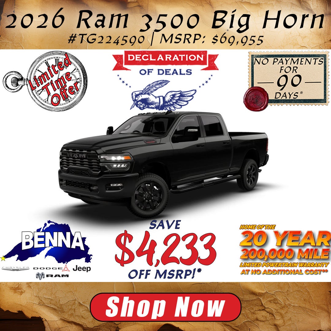 *Stock #TG224590. MSRP: $69,955. MSRP may not represent actual sales price. Total savings of $4,233 off MSRP which includes $3,233 Benna Dealer Discount + $1,000 National Bonus Cash. Buy for $65,722 plus tax, title, license and $499 service fee. On approved credit. Vehicle subject to prior sale. See dealer for details. Offer ends 4/30/2026. **20 Year / 200,000 Mile Limited Warranty Available on qualifying new vehicle purchases only. Warranty is not included with leases. Other restrictions may apply due to vehicle type, engine, mileage, and model year. See dealer for complete details. ***No Payments For 90 Days available on eligible 2025 and 2026 Chrysler Dodge Jeep Ram vehicles. 1st payment deferred up to 90 days from sale date. Interest accrues from sale date. Must finance through Stellantis Financial Services. Excluding 84-month financing. For well-qualified buyers, not all buyers will qualify. Contact dealer for complete details. Offer ends 4/30/2026.